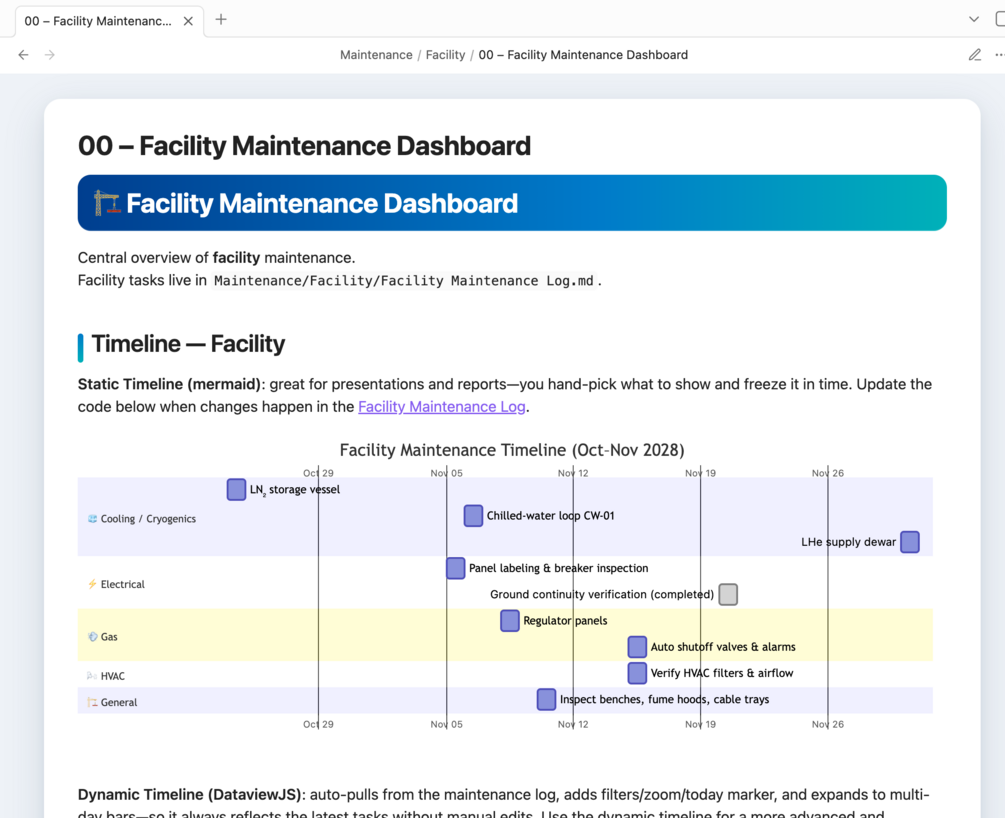 Built entirely in Markdown with Dataview and Tasks, the system provides live dashboards, role-based overviews, and visual clarity for real lab work.