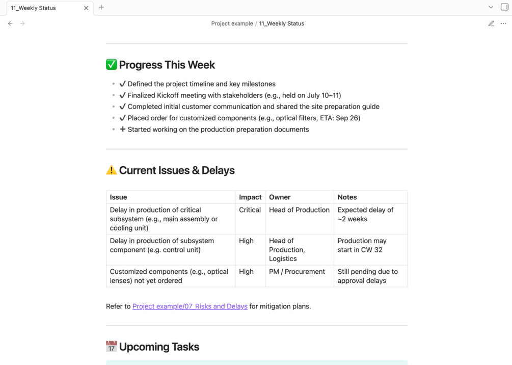 This intuitive, ready-to-use project management toolkit is designed specifically for technical project managers working in high-tech companies. Built in Obsidian (Markdown format), it supports structured and efficient documentation throughout the entire project lifecycle — from planning to closure.