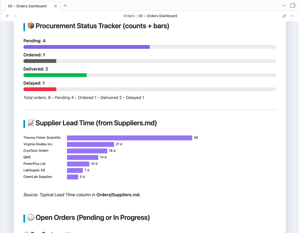 Built entirely for Obsidian, it helps applied sciences labs manage projects, measurements, instruments upkeep, inventory, orders, installation and more while keeping all records queryable, traceable, and visually clear.